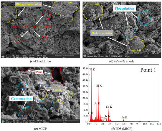 Figure 12 presents microstructural photographs at 2000× magnification of dispersive soil before and after various treatments. The untreated dispersive soil samples contain a high abundance of fine particles, resulting in a loose soil skeleton with large pores. Additionally, cracks form within the samples, indicating connectivity between the pores and cracks. Figure 12b shows that after EK (Electrokinetics) treatment, the number of pores, as well as the length and width of the cracks, is reduced. Meanwhile, the visible formation of aggregation in the soil indicates that, following the application of the electrokinetic method, there are changes in the arrangement, bonding, and interactions of soil particles, alongside a reduction in moisture content near the anode. Figure 12c illustrates that, with the addition of 4% additives, there is a substantial reduction in porosity and the dimensions of the pores, accompanied by an increase in particle agglomeration. The additives effectively fill the pores, leading to a denser soil structure, and the enhanced bonding between particles improves the integrity and strength of the soil [23]. Figure 12d demonstrates a relatively dense soil structure, with more concentrated pores that exhibit a more ordered distribution pattern. The pore size range is also smaller and fairly uniform. The presence of cementing materials is more pronounced, particularly at the points of particle contact where strong bonds are formed. The filling materials are abundant, occupying most of the pore spaces, which makes the entire structure appear more compact. In Figure 12e, it is observed that a number of calcium carbonate crystals fill the pores following MICP (Microbially Induced Calcite Precipitation) treatment. It possesses a certain degree of porosity along with good cementation, with the cementing materials distributed evenly and an adequate amount of filling materials. There are no significant cracks, and the overall structure appears to be relatively intact. Figure 12f shows the EDS (Energy-Dispersive X-ray Spectroscopy) results of the soil samples after MICP treatment, indicating high levels of oxygen (O), aluminum (Al), silicon (Si), and calcium (Ca). This confirms that the filler produced by MICP is primarily composed of calcium carbonate (CaCO3).