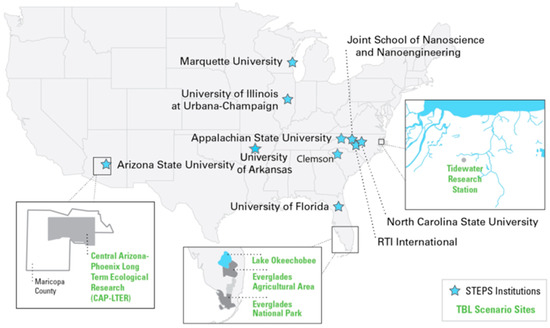 Map of the Science and Technologies for Phosphorus Sustainability (STEPS) Center’s institutions and the locations of the three initial Triple Bottom Line Scenario Sites (TBL Sites).