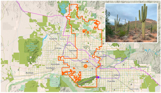 The greater Phoenix metropolitan area, outlined in red (OpenStreetMap.org, accessed 11 March 2024), and surrounding area, much of which is incorporated into the CAP-LTER program, the boundary of which is mirrored by the STEPS Center’s urban TBL Site. Insert: Saguaro cacti in the Sonoran Desert outside of Phoenix. Photo credit: Alison Deviney.