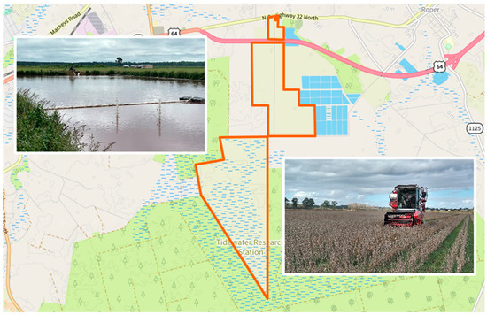 Tidewater Research Station, outlined in red (OpenStreetMap.org, accessed 11 March 2024), the boundary of which is mirrored by the STEPS Center’s agricultural TBL Site. Inserts: Swine lagoon at the research station (upper left) and a combine in a field (lower right). Photo credit: Alison Deviney, Luke Gatiboni.