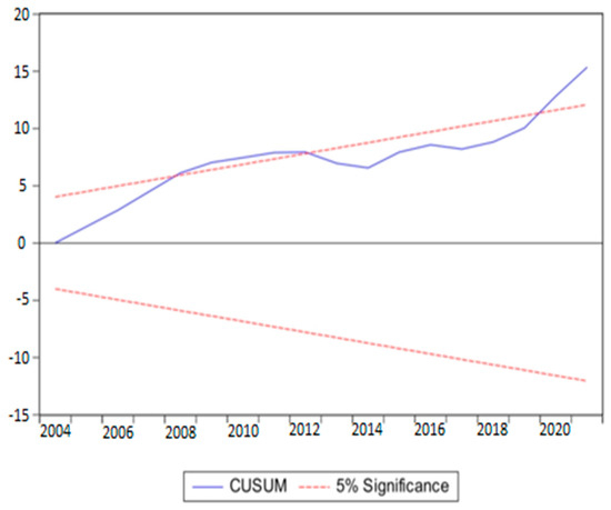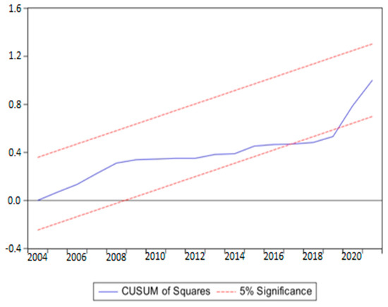 This work used CUSUM and CUSUMSQ, as seen in Figure 1 and Figure 2, to verify the stability of calculated parameters. At the five percent significance level, the figure confirms that CUSUM and CUSUMSQ are inside the crucial lines, suggesting that the model is stable and devoid of abrupt shocks or structural fractures.