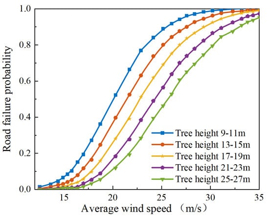 The probability of road failure caused by the toppling of roadside trees of different heights under the influence of wind speed.