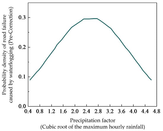 Referring to the research of Tian Hua et al., the relationship between rainfall factor (the cubic root of the maximum hourly rainfall) and probability density of road failure caused by waterlogging before correction () was determined (Figure 2) [25].