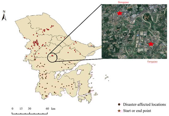 Study area showing disaster-affected points with path starting point (Fangqiao) and endpoint (Dongqiao).