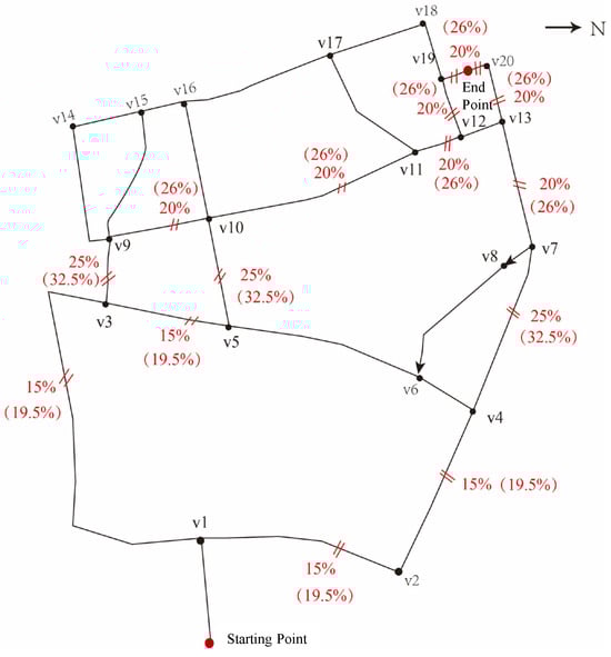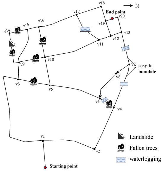 This paper presents a road network structure that reflects the actual disaster situation and geographic distribution characteristics through the topology of the road traffic and transport network. Figure 6 illustrates the unfolding of the road network between the start and end points, comprising a total of 20 intersections, including a one-way road segment. Additionally, an investigation is conducted into the various types of disaster-causing factors present on each road segment. As illustrated in Figure 6, there is only one landslide risk segment, which is located in Haishu district.