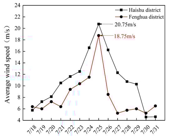 Since the study area is primarily concentrated in the Haishu and Fenghua districts, the average daily wind speeds in these regions before and after the typhoon’s landfall were collected, as shown in Figure 7. The typhoon lasted for two days, with the maximum wind speed occurring on the first day (25 July). The highest average wind speeds in the Fenghua and Haishu districts reached 18.75 m/s and 20.75 m/s, respectively.