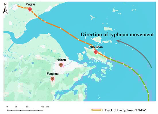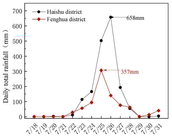 Figure 8 illustrates the daily total rainfall changes during the typhoon’s impact period in the Haishu and Fenghua districts. Overall, Haishu District experienced higher rainfall intensity. Fenghua District and Haishu District recorded their highest rainfall on the first and second days of the typhoon’s landfall, respectively. The difference in peak rainfall on different days is attributed to the typhoon’s trajectory. As shown in Figure 9, after making landfall near Zhoushan and moving northward, the typhoon turned westward toward Pinghu. Given Haishu District’s geographic proximity to Pinghu, it experienced heavy rainfall on the first day of landfall, with the second day seeing even more severe conditions.