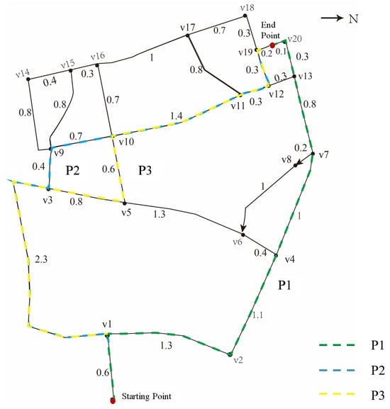 Determine the top three shortest paths in the transportation network using the K-shortest path algorithm and label them P1, P2, and P3. P1 passes through nodes with a transport distance of 5.2 km; P2 passes through nodes with a transport distance of 6.2 km; P3 passes through nodes with a transport distance of 6.5 km (Figure 14). Analyze them further to determine the best path with the best resistance to failure. It can be seen that P1 should be the optimal path for emergency livelihood material allocation in this road traffic network when the shortest road path is the optimal road path. However, there are several uncertainties associated with the typhoon disaster process, and waterlogging events often occur during typhoons due to the geographic location of Dongqiao. Therefore, it is essential to consider a range of disaster information when planning the paths of emergency material distribution vehicles.