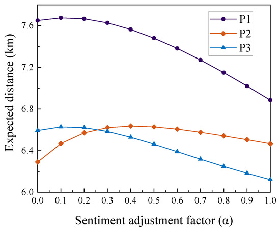 Changes in expected distance of different travel options under different sentiment adjustment factors.