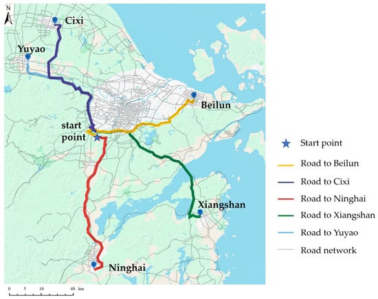 To extend the analysis, the study area was expanded to include the entirety of Ningbo City. For this supplementary analysis, the Ningbo Agricultural and Sideline Products Logistics Center was used as the starting point, with five specific core areas selected as destinations: Beilun, Yuyao, Cixi, Xiangshan, and Ninghai. Using sentiment factors derived from the BERT model, five paths to these destinations were determined based on road failure probabilities influenced by public sentiment, as illustrated in Figure 16.