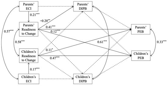 Figure 1 illustrates the relationships between Japanese parent–child dyads in environmental attitudes, psychological barriers, and PEBs using the SEM method integrated with APIM. The analysis yielded a good fit to the model (RMSEA = 0.064, CFI = 0.982). For both parents and children, the actor effects of readiness to change to their own PEB were significantly positive with similar strengths (βparents = 0.409, p < 0.001; βchildren = 0.470, p < 0.001). Furthermore, the partner effects of parents and children on readiness to change to PEB were positive (βparents-children = 0.116, p = 0.037; βchildren-parents = 0.114, p = 0.046), with slightly larger coefficients from parents to children. DIPB psychological barriers were not significant for PEBs, either as actor or partner effects. Figure 2 presents the APIM results for the Chinese parent–child dyads. The model fit indices were acceptable (RMSEA = 0.074, CFI = 0.981). Similar to the Japanese dyads, the actor effects of readiness to change on their own PEB were significant and positive (βparents = 0.187, p < 0.001; βchildren = 0.486, p < 0.001). The actor effect of children was stronger than that of parents. With regard to the partner effects, children had a stronger influence on parents from readiness to change to PEB (βchildren-parents = 0.286, p < 0.001) compared to the parents’ influence on children (βparents-children = 0.110, p = 0.008). Moreover, the partner effects of readiness to change to DIPB were significant and negative in both relationships (βparents-children = −0.159, p = 0.001; βchildren-parents = −0.206, p < 0.001). Children’s DIPB was found significant and positive toward their PEB (βDIPB-PEB = −0.168, p = 0.006), while parent’s DIPB was not.
