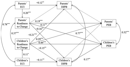 APIM-SEM results on Chinese parent–child relationships on environmental attitude, psychological barriers, and PEB. Note. N = 452. χ2(8) = 27.57, p < 0.001, RMSEA = 0.074, CFI = 0.981, SRMR = 0.053. Significant at * p < 0.05, ** p < 0.01, *** p < 0.001. Solid and dotted lines indicate significant and insignificant paths, respectively.