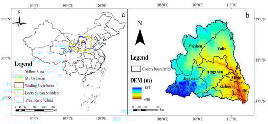 The WRB is situated in the middle reaches of the Yellow River Basin, covering the northern part of the Loess Plateau and the southern edge of the Mu Us Desert (Figure 1a). The WRB originates from Baiyu Mountain in Dingbian County, Shaanxi Province. It flows through Wushen County, Inner Mongolia, and several counties in Shaanxi Province, including Yulin, Hengshan, Mizhi, Jingbian, Zizhou, and Suide. The river eventually merges with the Yellow River in Qingjian County (Figure 1b). Major tributaries are the Yuxi, Lu, Dali, and Huaining rivers. This study focuses on the portion of the WRB upstream of the Baijiachuan Hydrological Station, encompassing an area of 29,609.94 km2. The population of the study area is approximately 5.0 million. The basin’s geographical coordinates range from 108°05′ E to 111°01′ E and 37°02′ N to 39°05′ N, with elevations ranging from 690 to 1831 m, as shown in Figure 1b.