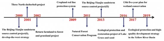 Over the past two decades, extensive ecological restoration projects have been undertaken in the WRB (Figure 2). From 2000 to 2005, projects such as the Beijing-Tianjin Sandstorm Source Control Project, the Natural Forest Protection Program, and the Grain for Green Project were launched. These projects effectively curbed the expansion of cropland and significantly increased forest and grassland areas. Between 2005 and 2010, efforts were expanded with the continuation of natural forest protection and the further implementation of the Grain for Green Project. Additionally, the “cropland red line” was established to secure agricultural land for food production and safety. From 2010 to 2020, comprehensive ecological restoration measures were introduced, including the continuation of the Beijing-Tianjin Sandstorm Source Control and wetland restoration. Over the past two decades, the WRB has achieved notable progress, characterized by the retreat of sand, the expansion of vegetation, and the reduction of desertification, reflecting a clear trend toward ecological improvement.