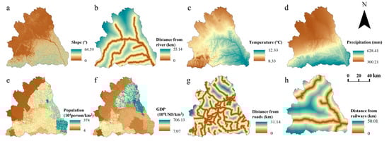 Spatial distribution of driving factors. (a): slope; (b): distance from river; (c): temperature; (d): precipitation; (e): population; (f): GDP; (g): distance from road; (h): distance from railways.
