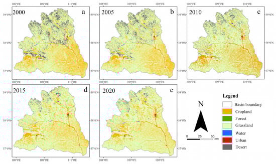 Spatial distribution of LULC (a–e) from 2000 to 2020.