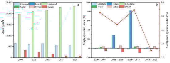 Area (a) and dynamic index (b) of LULC from 2000 to 2020.