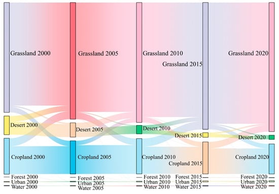 From 2000 to 2020, the dynamic characteristics of different LULC types exhibit variability (Figure 5b). Grassland represents the largest and most extensively distributed land cover type in the study area, accounting for over 75% of the total area. Its average annual dynamic degree is 0.83%, with the highest observed between 2000 and 2005 (1.24%). Due to the substantial base area of grassland, its dynamic degree exhibits relatively minor fluctuations. Forest has an average annual dynamic degree of 28.39%, reaching its peak between 2010 and 2015 (82.38%). Forest demonstrates the most pronounced expansion and dynamic degree among all land cover types, attributed to its relatively small initial area. Urban areas show an initial increase in dynamic degree, which then decreases, falling from 5.04% in 2000 to 4% in 2020. This trend indicates a gradual deceleration in urbanization and a move towards stabilization. Among the six land cover types, only cropland and desert exhibit negative average annual dynamic degrees of −0.82% and −5.98%, respectively. The rates of decrease are most rapid between 2010 and 2015, with dynamic degrees of −1.86% and −9.34%. Water bodies experience minimal absolute changes, resulting in a lower dynamic degree. The comprehensive dynamic degrees for LULC over the four periods from 2000 to 2020 are 0.85%, 0.68%, 0.89%, and 0.30%, respectively. The higher dynamic degrees in 2000–2005 and 2010–2015 reflect a pattern of initial decrease, followed by an increase, and subsequently a decrease.