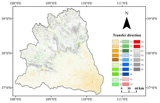 Spatial heterogeneity is evident in the LULC changes across different regions of the WRB. The spatial transition map (Figure 7) indicates significant decreases in desert areas in the northwest and cropland in the southeast, with both primarily transitioning to grassland. During the land use/land cover transition in the WRB, the main transition patterns are from desert and cropland to grassland, with the largest area of desert transitioning to grassland. The area of desert-to-grassland transition accounts for 90.77% of the net desert transition area, primarily concentrated in the upper reaches of the basin, including Wushen County in Ordos, Inner Mongolia, and the northern part of Yulin, Shaanxi. The area of cropland-to-grassland transition accounts for 36.52% of the net cropland transition area, mainly concentrated in the downstream regions, such as Mizhi County and Zizhou County.