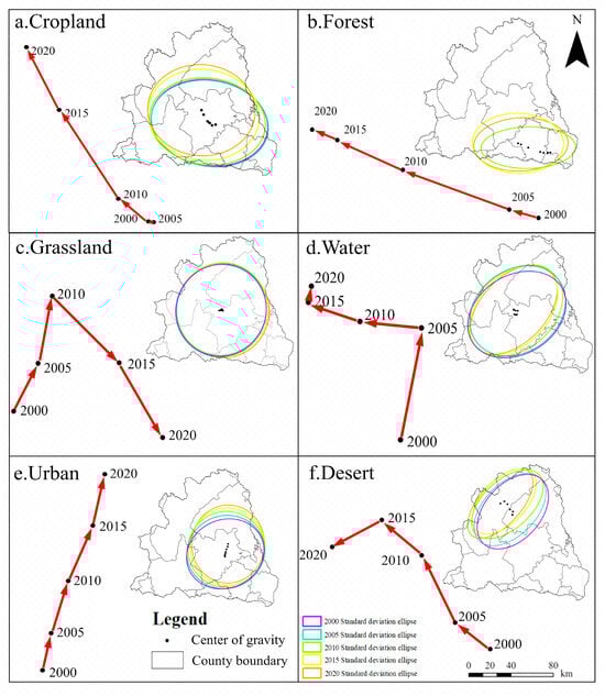 From 2000 to 2020, the centroid migration trajectories and the sizes of standard deviation ellipses for different land types in the WRB displayed significant variations (Figure 8). Detailed parameters for ellipses can be found in Appendix A (Table A5). The analysis of migration directions and distances (Table 4) reveals the following trends. The centroid of the cropland, originally centered in the midstream region, specifically in Hengshan County, shifted 10 m southeast before moving northwest after 2005. For forest, the centroid, located downstream in Zizhou County, generally migrated northwestward, with the fastest migration occurring between 2005 and 2010 when it reached 200 m. The continuous northwestward migration of cropland and forest suggests that the “Grain for Green” policy and forest restoration efforts gradually shifted from downstream to upstream areas. The centroid of grassland remained mostly in western Hengshan County, in the midstream region. After 2000, the large-scale conversion of desert to grassland in the northwest, together with the increasing conversion of grassland to cropland in the southeast after 2010, shifted the grassland centroid’s migration trajectory from northeast to southeast. The minimal migration of grassland, as indicated by the overlapping ellipses, results from its extensive coverage, which accounts for 78.16% of the total basin area. The centroid of water bodies generally migrated northward, with the focus shifting to western Hengshan County. The centroid of urban areas in the midstream region shifted northeastward. The slowing expansion rate of urban ellipses suggests urbanization is stabilizing. Lastly, the centroid of desert areas, located upstream in Wushen County, migrated northwestward, at the fastest rate between 2010 and 2015. The shrinking desert ellipse reflects successful desertification control through ecological restoration efforts.
