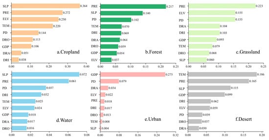 From 2000 to 2020, the factors influencing LULC changes can be grouped into two categories: urban land changes are predominantly driven by anthropogenic factors, whereas other LULC types are mainly influenced by natural factors. Slope has the most significant influence on cropland changes (36%), followed by precipitation (27.20%) and elevation (25%). For forests, precipitation exerts the largest influence (21.70%), followed by slope (14%) and population density (10.20%). Grassland is primarily affected by precipitation (22.30%), with elevation and population density each contributing 15.50%. Water bodies are minimally influenced by both natural and anthropogenic factors, as indicated by q-values below 10%, with slope having the greatest effect (7.20%), followed by precipitation (6.10%) and population density (3.70%). Changes in barren land are primarily influenced by mean annual temperature (18.60%) and precipitation (16.50%). Urban area changes are strongly correlated with economic factors (q = 0.28) and population density (q = 0.08). Overall, except for urban land, changes in other LULC types are largely determined by geographical characteristics, with natural factors playing a dominant role in vegetation restoration relative to anthropogenic factors. This indicates that regional climate change has facilitated the effective implementation of human-driven ecological initiatives.