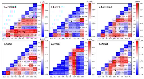 To explore the driving mechanisms of LULC changes in the WRB, this study applies the geo-detector model to quantify the influence of various factors. The changes in LULC area are used as the dependent variable (Y), with nine influencing factors identified as the independent variables (x). The analysis of these factors, based on their explanatory power (q-value) (Figure 9), shows significant variation in their influence on LULC changes. All factors show significant correlations with LULC changes at the 0.05 confidence level.