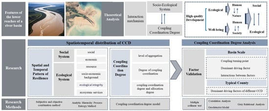 This study aims to investigate the coupling and coordination relationship between society and the ecosystem in economically dense downstream regions of rivers, specifically focusing on the lower reaches of the Yellow River from 2000 to 2022. It consists of two main components: the CCD assessment and the analysis of driving factors.