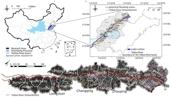 The study focuses on the Shandong segment of the lower Yellow River, spanning 628 km and covering 18,300 square kilometers. This region exhibits a diverse landscape, transitioning from wide to narrow, and steep to gentle terrains [26]. It includes 9 municipalities and 25 counties, with emphasis on those bordering the river and their floodplain areas (Figure 2).