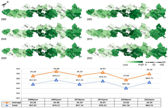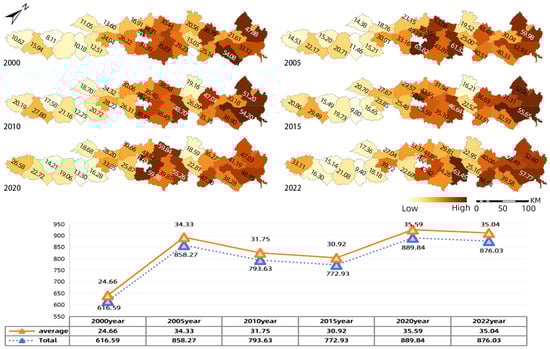 From 2000 to 2022, the SR in the lower Yellow River Basin exhibited significant changes in both temporal and spatial dimensions. At the city level, Jinan and Dongying exhibited relatively high social resilience, while counties such as Pingyin, Licheng, and Hekou showed higher resilience, whereas counties like Mudan and Liangshan showed room for improvement. Overall, SR displayed an upward trend during this period, with the SR total value increasing by 259.43 points, a growth rate of 42% (Figure 3). However, this growth was not stable, with negative growth observed between 2005–2015 and 2020–2022. In terms of key indicators, social-related indicators such as urbanization rate, road network density, and per capita arable land showed an upward trend, with urbanization primarily occurring in the central and eastern regions, while road network density grew more in the western regions. Economic indicators, such as per capita GDP and industrial output in the eastern and central regions, displayed significant regional disparities (Appendix E, Figure A1). In general, the changing trends of social resilience in the lower Yellow River Basin reflect both the region’s economic development and infrastructure improvements, and also reveal its capacity to cope with natural disasters and socio-economic transformations.