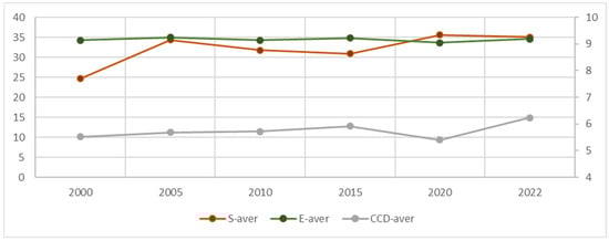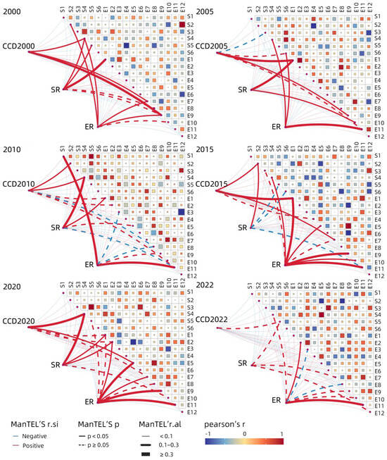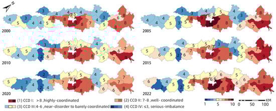 The CCD showed fluctuating growth, with low points in 2020 and recovery by 2022. Spatially, higher CCD values were concentrated in the eastern and central regions, while the western regions remained vulnerable to disorder. CCD inflection points occurred in 2010 and 2020, marking significant shifts in regional coordination levels (Figure 5).