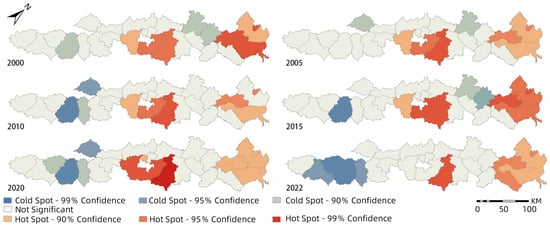 Hot/cold spot analysis is used to identify clusters of high (hot spots) and low (cold spots) values of the coupling degree between social and ecological systems [43]. This method goes beyond global spatial autocorrelation by pinpointing specific locations where values are statistically significantly high or low, thus highlighting areas of significant spatial clustering. The analysis tests the statistical significance of clustering using standardized z-values, which indicate the extent to which observed clustering deviates from a random distribution. Hot spots correspond to areas of high coupling degree, while cold spots represent areas of low coupling degree, indicating significant spatial dependence among these regions.