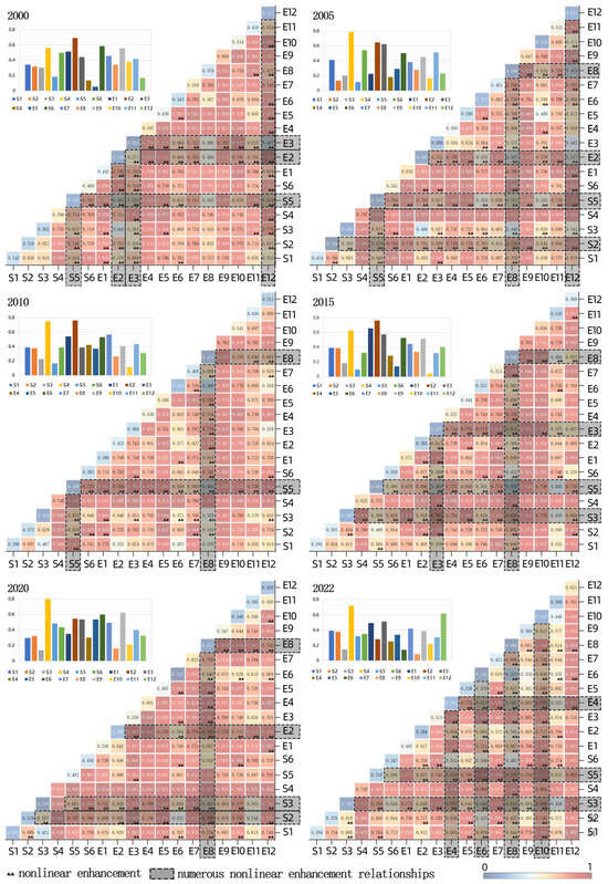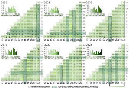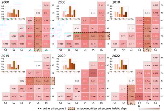 where q represents the detection value of the influencing factor’s spatial heterogeneity, ranging from 0 to 1. A larger q value indicates stronger explanatory power of the factor for the spatial heterogeneity of the dependent variable. In this formula, i represents different strata of the influencing factor, ranging from 1 to L. n denotes the total sample size of the study area, while ni represents the sample size in the ith stratum. σ2 is the variance of the dependent variable across the entire study area, and σi2 represents the variance of the dependent variable in the ith stratum. The GD model categorizes interactions between two factors as nonlinear weakening, single-factor nonlinear weakening, two-factor enhancement, independence, or nonlinear enhancement, allowing for a nuanced understanding of spatial influences [55,56,57].