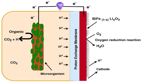 The cathodic material is also a crucial determinant of wastewater treatment efficiency and output power in MFC systems. Cathodic materials remain a limitation in MFC efficiency. An optimal cathode is to have optimally small corrosion, sufficient conductivity, large specific surface area, high porosity, and excellent redox potential. The redox potential of cathodes is a necessary parameter for the convenient capture of protons and effective MFC improvement [156]. Oxygen reduction often takes place within the cathode, which limits the reaction rate. Oxidants, which are acceptors of electrons, e.g., permanganate and ferricyanide, have been employed to improve oxygen reduction, despite the fact that oxygen is the most effective oxidant in cathodes. Air cathodes and aqueous air cathodes are the major candidates in lab-scale MFC systems, where dissolved oxygen is employed. Biocathodes have also recently been of interest to researchers [157].