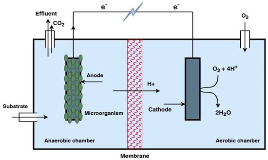 Michael C. Potter (1910) proposed the exploitation of microbes for energy generation. Escherichia coli and Saccharomyces bacteria were employed to generate electricity in 1931. Barnett Cohen proposed a biological power generation system with a voltage of 35 V and a current of nearly 0.2 A [31]. Habberman and Pommer (1990) introduced an MFC system that would generate electricity through municipal wastewater for a continuous five-year period (1986–1990). Their system required no maintenance interventions [32]. Wastewater electricigens may serve as catalytic agents that decompose molecules of organic contaminants and generate bioelectricity based on bacterial metabolism [33]. The performance of the system was heavily dependent on the design of the MFC system [33]. Poor power outputs remain the major disadvantage of the current MFCs. It is necessary to optimize MFC systems to optimally generate electricity [34]. An MFC is comprised of a pair of chambers, including an aerobic cathodic chamber and an anaerobic anodic chamber. Biological activities and electrochemical processes are to be optimized by the chambers. Microorganisms in the anodic chamber oxidize organic substrates, most importantly bacteria, in wastewater. The organic substrates supply the energy of microorganisms, contributing to the breakdown of organic compounds. The oxidization-generated electrons run through an external circuit to the cathodic chamber, generating a current usable for multiple purposes, e.g., energy storage and electronic modules [35]. The aerobic cathodic chamber enables different reactions. The incoming electrons are combined with the oxygen content of the chamber and produce H2O. The flow of H+ ions through an electrolyte, which is often facilitated by a proton exchange membrane (PEM), removes heavy metal content. This chamber division and biological and electrochemical reactions effectively convert organic substrates into power, remove heavy metals, and facilitate wastewater treatment [35].