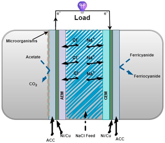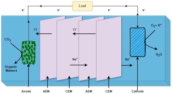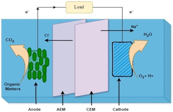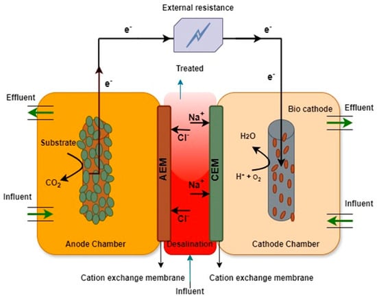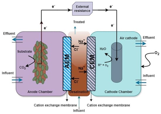 Air cathode MDC systems have a cathode chamber, an anode chamber, and a desalination chamber. The electrode of the cathode chamber is exposed to ambient air on one side. The atmospheric oxygen is a terminal acceptor of electrons. Oxygen possesses a great reduction potential and is abundant and affordable, representing a desirable terminal acceptor of electrons. Mehanna et al. [83] confirmed the air cathode MDC system. The air cathode MDC may enable a 63% decrease in water salinity in one cycle in the presence of a C-fiber electrode with a Pt catalyst. Mehanna et al. [84] employed Pt/C electrodes and reported that the water–salt conductivity dropped to 43% within the air cathode MDC. However, the peak power density was improved to 480 mW/m2, while the columbic efficiency was found to be 68 ± 11%.