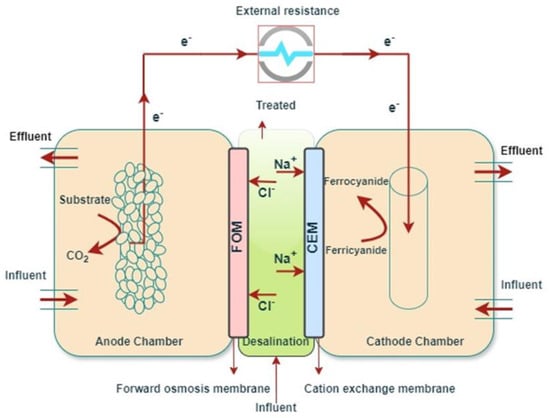 Osmotic MDCs use a forward osmosis (FO) membrane in place of the AEM. Wastewater is treated by flowing from the anode toward the desalination chamber. The FO membrane enables the lobbing of water and reduces ion transfer from the intermediate component to the electrodes. This concentrates salts rather than removing them [76]. The sullying vulnerability of FO membranes is higher than that of ion exchange membranes (IOMs). This, in turn, may worsen the inner battery challenge and reduce the water flow. Current efficiency enhancement is a topic of research in osmotic MDC studies [96] (Figure 8).