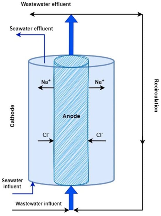 An up-flow MDC is comprised of a tubular reactor that has a pair of co-axially configured tubes. The anode is the inner chamber; whereas, the outer chamber is the desalination chamber, with an IEM separating the two chambers. The outermost cover is the cathode. The AEM is situated near the anodic surface, and the CEM is used on the outer surface of the desalination chamber [100,101]. Graphite particles are employed to fill the internal cavity, increasing the surface area for oxidation and keeping microbial species within the suspension to contribute to organic matter oxidation with greater efficiency. A tube with CEMs and AEMs replaces the anode chamber to provide the cathode and desalination chambers, respectively. This raises the surface area for treating salt water [46,102]. A carbon cloth in an up-flow MDC replaces the cathode chamber near a reactor surrounding the desalination chamber comprised of a C-Pt mixture. Saline water flows into the system through its bottom, and desalinated water leaves the system on the top. Hydro-osmosis and up-flow MDCs can enable a desalination efficiency rate of 100% [46,103]. The need for no external mixing and high-water recovery are key advantages of up-flow MDCs, given osmotic pressure initiation in the reactor. Microbial species in the anodic chamber remain within the suspension and effectively oxidize the organic matter. As a result, greater desalination efficiency and a more significant power density can be obtained in a more straightforward system [24,71] (Figure 10).
