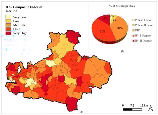 From the aggregation of all the category indices, the composite Index of Decline (ID) is obtained according to the same procedure described to calculate the category indices for each k-th municipality (4). The spatialisation of the ID allows to map the IPs, the RIP areas, and the poles, according to the values assumed by this index, classified into five classes: Very Low (Poles-I Level), Low (Poles-II Level), Medium (RIP), High (Inner Peripheries-I Degree), and Very High (Inner Peripheries-II Degree).