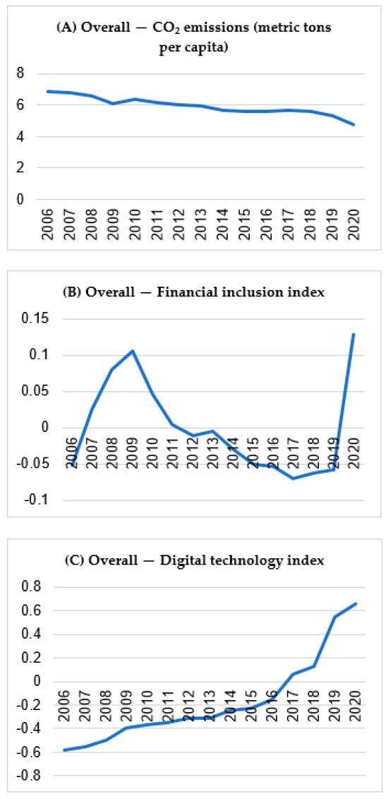 4.1. Trends of CO2 Emissions, Financial Inclusion, and Digital Technology