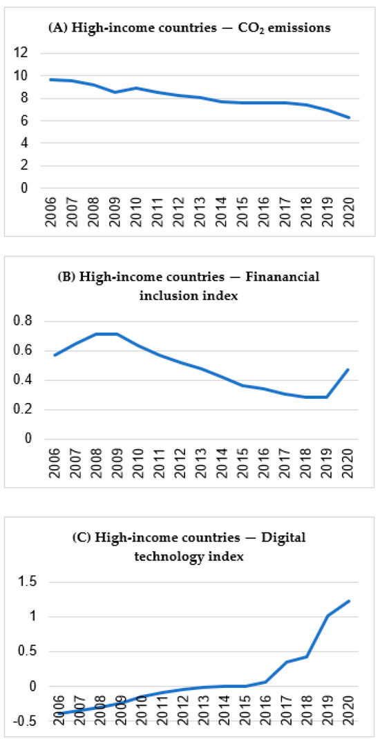 Furthermore, according to Dong et al. [53], the level of CO2 emission and its drivers vary significantly between countries with different income levels. Despite the identification of CO2 emissions’ drivers at various levels, such as national, regional, and global, the differences between countries with different income levels seem to have received inadequate attention. We found one study by Dong et al. [53] which reports that while countries with low and middle incomes have been contributing to global CO2 emissions recently, primarily high-income or industrialized countries bear the main historical responsibility for the current concentration of CO2 in the atmosphere. Therefore, high-income countries have the highest obligation to reduce their CO2 emissions. At the same time, high- and middle-income countries also need to make efforts to limit the growth of their emissions in the future. Our study aims to examine the differences in the nexus between financial inclusion, digital technology, and CO2 emissions between the high-income and low- and middle-income country groups.