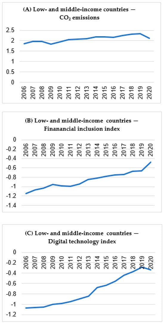 Trends of CO2 emissions, financial inclusion, and digital technology in low- and middle-income countries. Note: The values used in the chart represent the average values across the 14 low- and middle-income countries in the study sample for CO2 emissions (metric tons per capita) (A); financial inclusion index—FI (B); and digital technology index—DT (C).