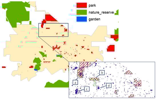 Example of public greenspace data derived from OSM for Gainsville, FL, USA. Figure inset compares OSM-derived accessible greenspace with ESRI “parks and natural areas” geodataset (https://hub.arcgis.com/datasets/esri::usa-parks/about, accessed on 25 November 2024). Red line pattern: OSM-derived public greenspace; green line pattern: ESRI USA parks; blue dots: iNaturalist observations. Highlights: a—ESRI misses public greenspace; b—ESRI incorrectly marks private land as accessible; c, d—research in publicly inaccessible areas.