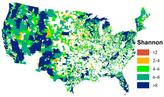 Shannon biodiversity index with a census block granularity computed from iNaturalist data. Missing data represent the areas with a small number of observations.