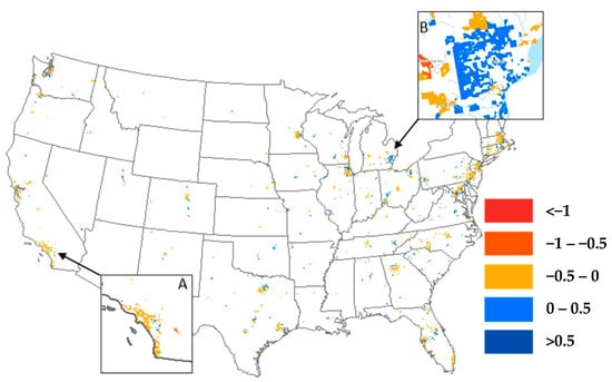 The coefficient for the overall vulnerability variable in the GWR model for urban locations. Negative values point to the areas where lower biodiversity of the greenspaces relates to higher vulnerability of the population. Map insets contrast the Los Angeles area (A) with Detroit (B), in which this pattern is reversed due to the city rewilding efforts combined with natural revegetation in depopulated areas.
