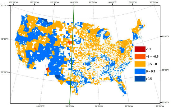In comparison to the OLS model, the GWR model for rural areas offers significantly enhanced explanatory power (R2 = 0.38; R2adj. = 0.35). The AICc is reduced from 58,017 in OLS to 55,003 in GWR, which justifies replacing OLS with the GWR model in the analysis. A Moran’s I value of 0.05 signifies that the autocorrelation of GWR residuals is minimal. While the urban model exhibits negative coefficients for the overall vulnerability variable (Figure 4), the rural GWR model shows a more intricate pattern (Figure 5), with vulnerability coefficients tending to be negative in the eastern part of the country and positive in the west. Relating to the famous 100° west meridian, which separates the generally arid American West from the relatively humid East, negative values of vulnerability coefficients are prevalent in 69% of the eastern areas, compared to only 44% of the western region. This trend holds true for all four vulnerability dimensions (Table 4 and Appendix A Figure A1).