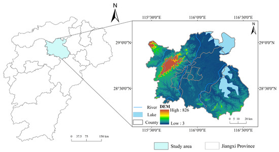Nanchang, located in north-central Jiangxi Province, eastern China, is the core city of the Poyang Lake Ecological Economic Zone. It lies downstream of the Ganjiang and Fuhe Rivers (Figure 1). Notably, Nanchang is the only provincial capital designated as a pilot city for low-carbon economic development, making it an important comprehensive demonstration area for ecological urban development [31]. The city is situated in a subtropical monsoon climate zone, characterized by rainy and hot in the same season and four distinct seasons. With abundant rainfall, it is among the rainiest regions in China. However, the uneven distribution of rainfall would often result in droughts or flooding disasters. Nanchang also boasts abundant ecological resources, including a portion of Poyang Lake, the largest freshwater lake in China. The city has 1.4 × 105 hectares of forestry land, with 1.2 × 105 hectares of forested area, resulting in a forest coverage rate of 23%. In 2019, the urban greening coverage rate reached 42.08%, while the vegetation coverage rate was 65.69% across Jiangxi Province, placing it at a medium-to-high level of vegetation coverage [32]. In recent years, the frequency of extreme weather events has continued to rise due to ecological degradation [33], further intensifying the impacts on NDVI evolution.