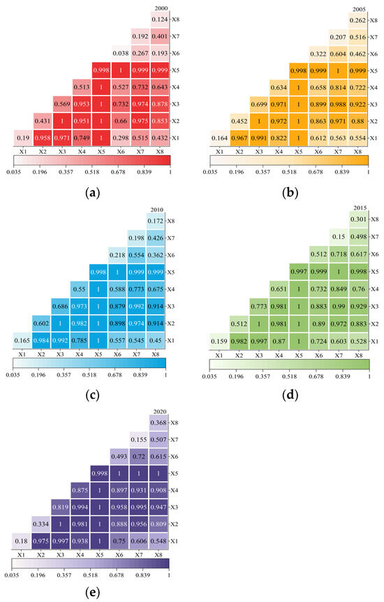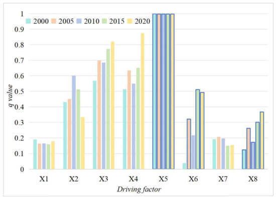 As one of the models in geographical detection, the factor detector focuses on critically analyzing the relationship between geographic entities and spatial variability in environmental factors at specific spatial locations [48]. Spatially, if changes in geographic entities at a given point align with changes in environmental factors, then that environmental factor plays a significant role in the alteration of geographic entities.