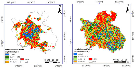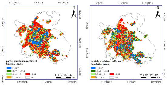 Spatial distribution of partial correlation between NDVI and nighttime lights and population density in Nanchang City during 2000 to 2022.