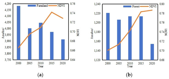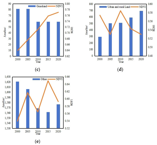 Areal and NDVI changes of different land cover types in Nanchang City during 2000 to 2022: (a) Farmland, (b) Forests, (c) Grasslands, (d) Urban and rural land and (e) Other types.
