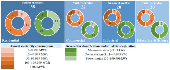 Moreover, each profile is further assigned to one of five annual consumption levels and three power generation types as defined by Latvia’s legislation [21]. According to the solar installation capacity calculations outlined in Section 2.2, which are based on annual consumption, each participating consumer is categorised either as a microgenerator or a power plant and further classified into one subgroup based on capacity thresholds (11.1 kW, 49.9 kW, 999.9 kW). Subsequently, the capacity of solar installations is modified to align with the group classification. For example, if the initial PV system power for a residential load profile is 12 kW, then after the classification process described above, it should be adjusted to 11.1 kW accordingly to Latvia’s legislation. Thus, the PV-rated power for each load profile is adjusted and used for subsequent calculations, as detailed in Section 2.3.